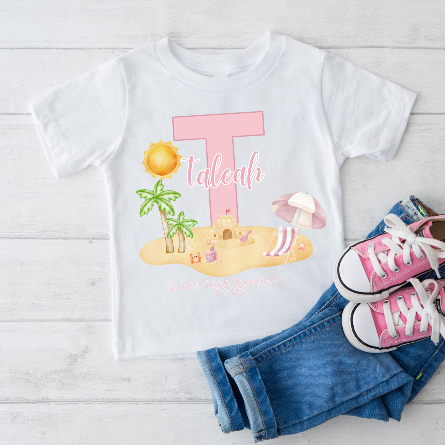 Personalised Pink Initial Holiday T-Shirt – Tropical Beach Design